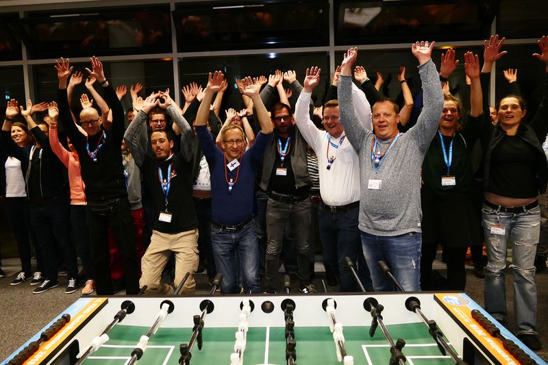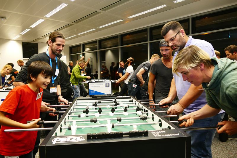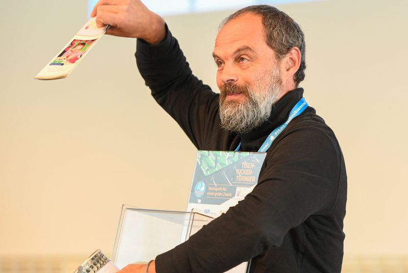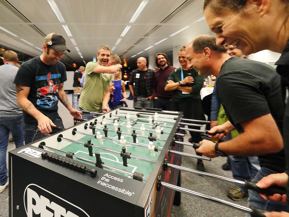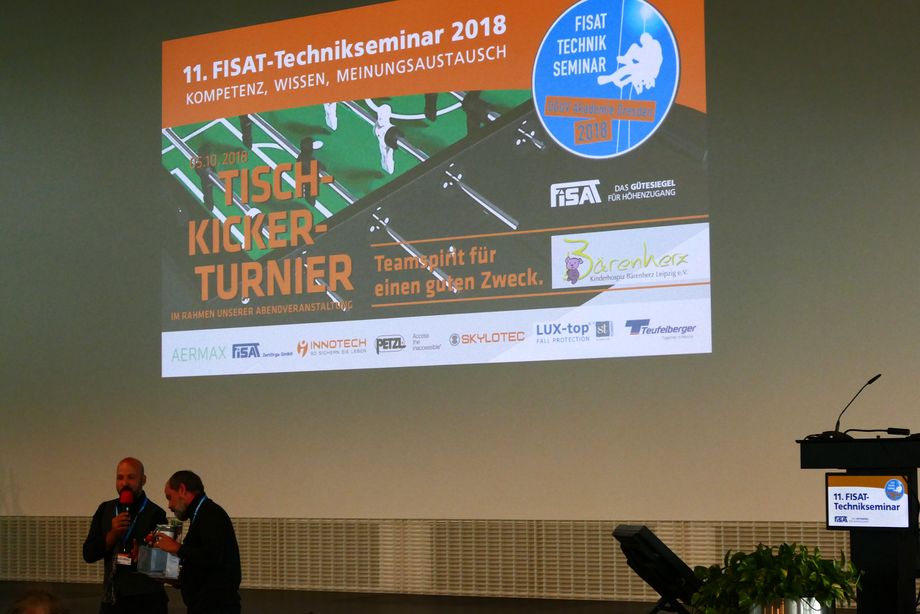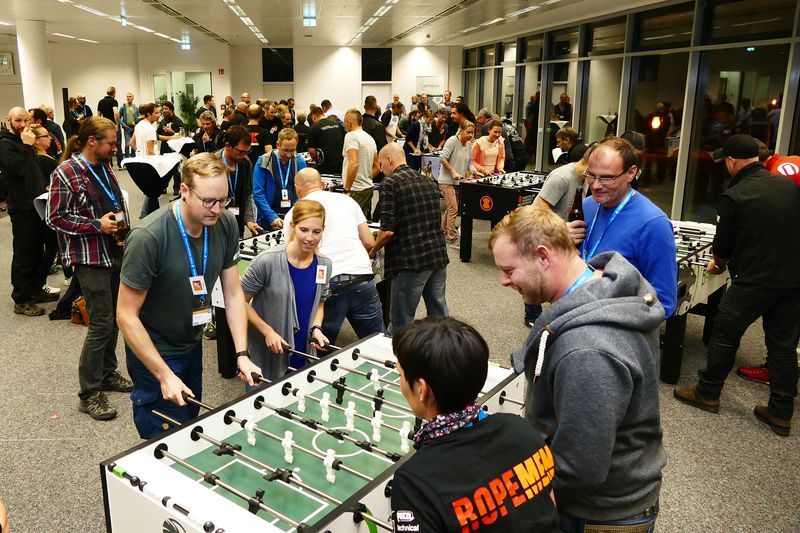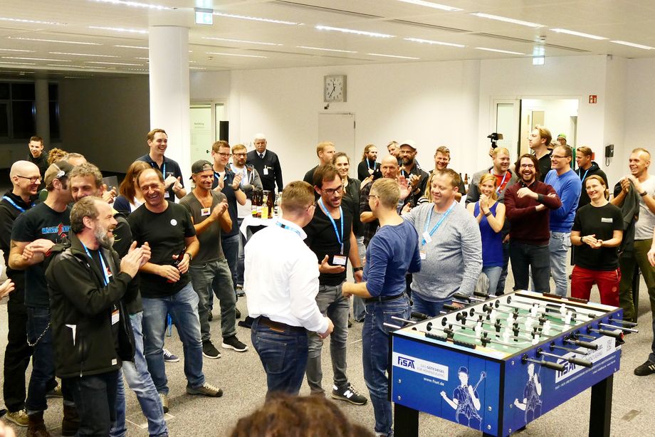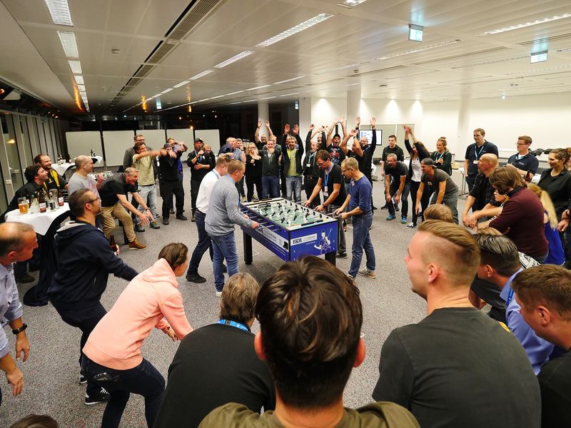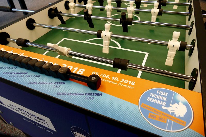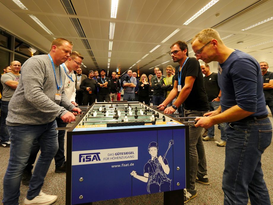 Im Rahmen unserer Abendveranstaltung bildete – nach einem gemütlichen Abendessen samt Networking und Erfahrungsaustausch – unser Benefiz-Tischkicker-Turnier den Abschluss und sportlichen Höhepunkt des weit fortgeschrittenen Tages: An insgesamt zehn, größtenteils im Look der anwesenden Aussteller gestalteten Kickertische traten unter tatkräftiger Unterstützung ihrer riesigen Fanbasis fast 60 Starterinnen und Starter in zugelosten Zweierteams zwar gegeneinander aber immer für einen guten Zweck an: Die zu entrichtenden „Startgelder“ für das Turnier sowie namhafte Beträge von den Ausstellern auf dem FISAT-Technikseminar sowie anderen Unterstützern gehen auch in diesem Jahr direkt an des Kinderhospiz Bärenherz in Leipzig.
