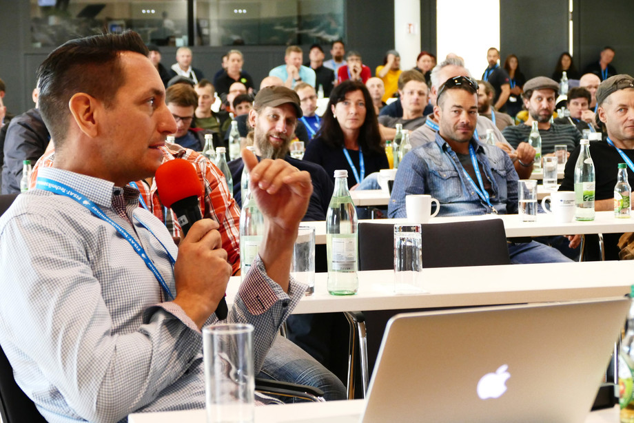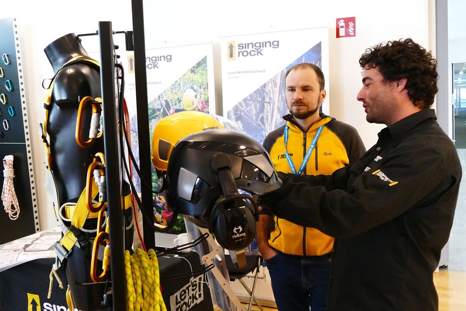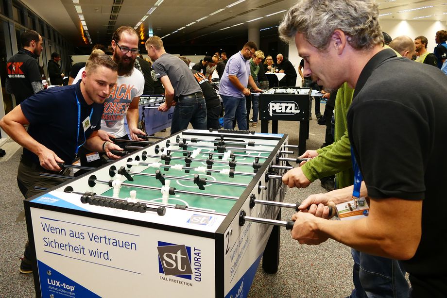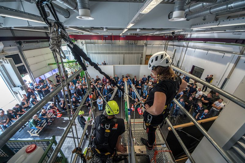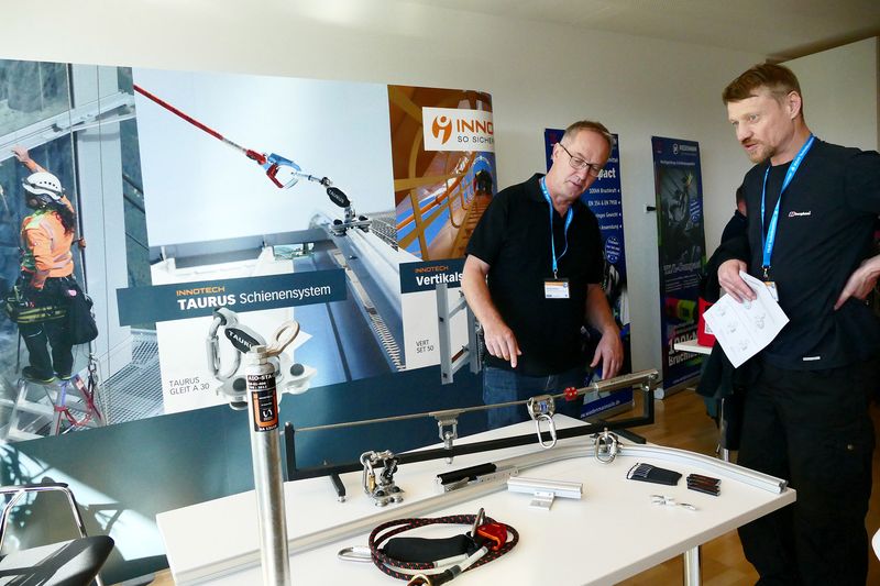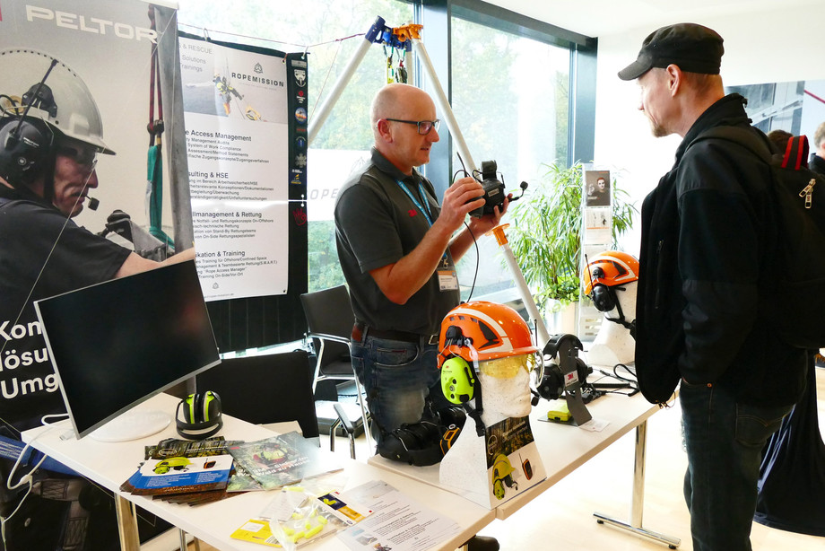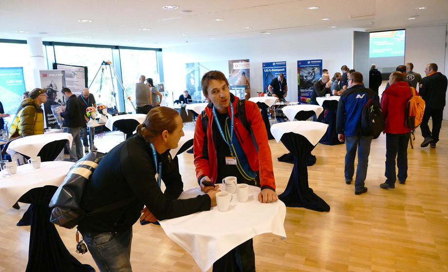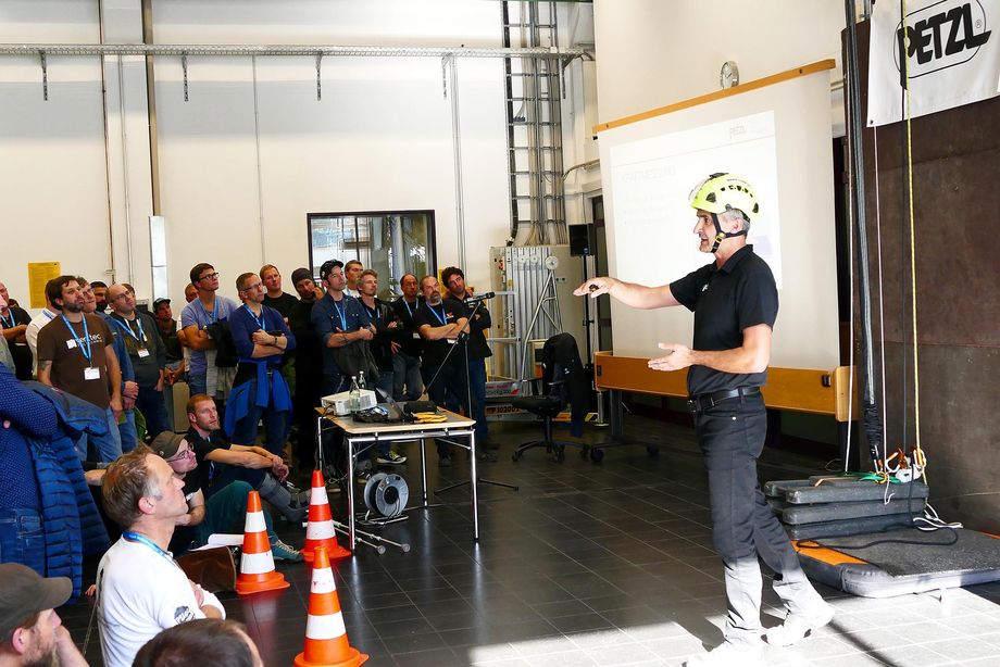 Sacha Poscher, Sachverständiger und Geschäftsführer von VerticalWork, sprach im großen Saal über die „Gruppendynamik in SZP Teams“. Höhenarbeiter Volker Juhls gab dem Auditorium einen Einblick anhand eines persönlichen Erfahrungsberichts: „Unfall durch die Umgebungsbedingungen – ein Erfahrungsbericht“.