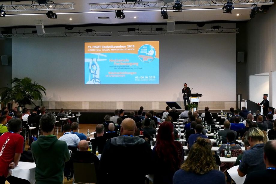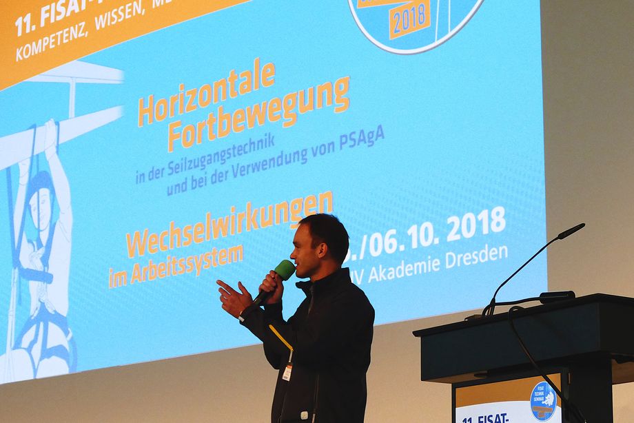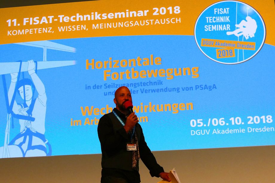Bei traumhaftem Herbstwetter reisten 200 Teilnehmerinnen und Teilnehmern aus dem In- und Ausland nach Dresden: Am 5. und 6. Oktober 2018 veranstalteten wir unser 11. FISAT-Technikseminar auf dem Gelände der DGUV Akademie Dresden im Tagungszentrum des IAG. Leitthemen unserer etablierten Branchenveranstaltung rund um den Bereich Seilzugangstechnik waren in diesem Jahr die Horizontale Fortbewegung in der Seilzugangstechnik und bei der Verwendung von PSAgA und Wechselwirkungen im Arbeitssystem.