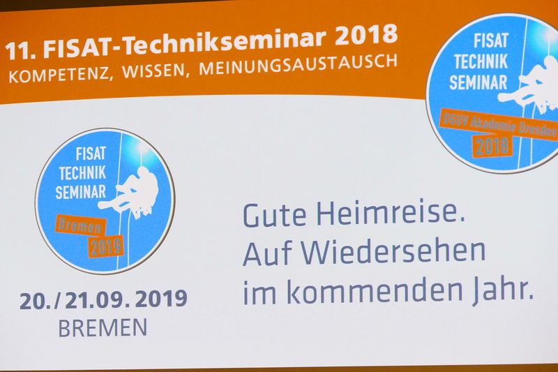 Das 12. Technikseminar des FISAT wird im kommenden Jahr in Bremen stattfinden. Also bitte im Kalender vormerken: 20. und 21. September 2019, 12. FISAT-Technikseminar Bremen. Und dann unbedingt rechtzeitig anmelden. Bleibt gesund. Auf Wiedersehen in Bremen!
