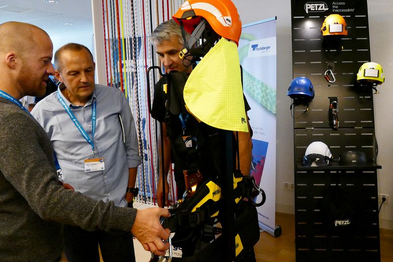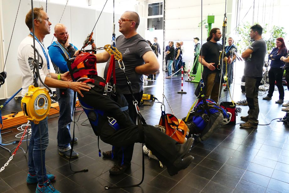 1.) Zum Thema „Praktische Hilfsmittel - Ergonomie beim Arbeiten und Retten“ stellten Stephan Sander (Special Access Solution & Service), Mathias Kahle und Frank Schulzendorf (Alpintec GmbH) technische Hilfsmittel für ein ergonomischeres Arbeiten vor und demonstrierten deren Benutzung.