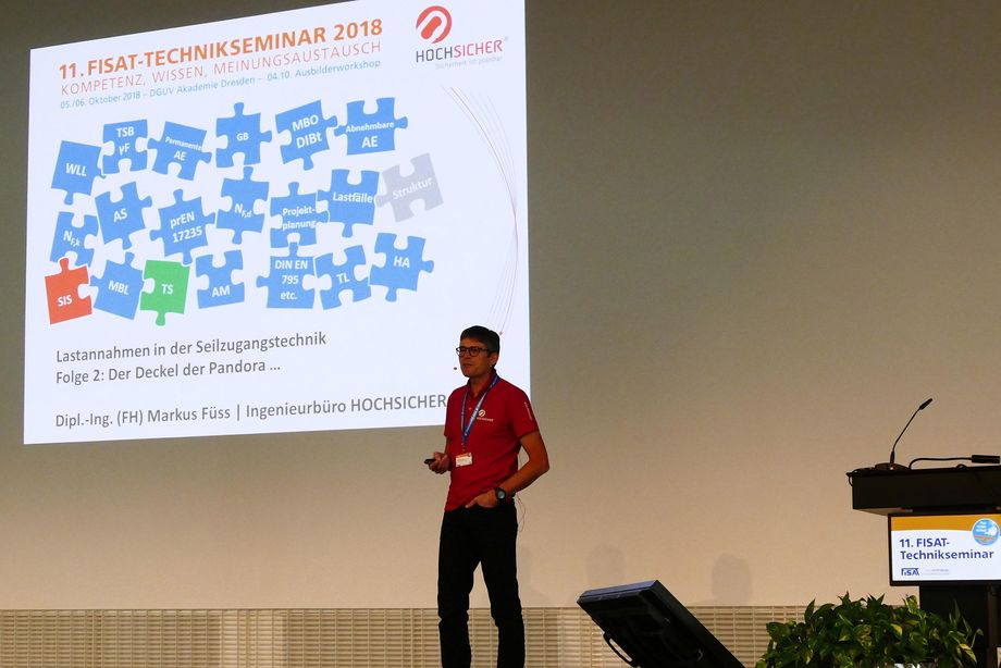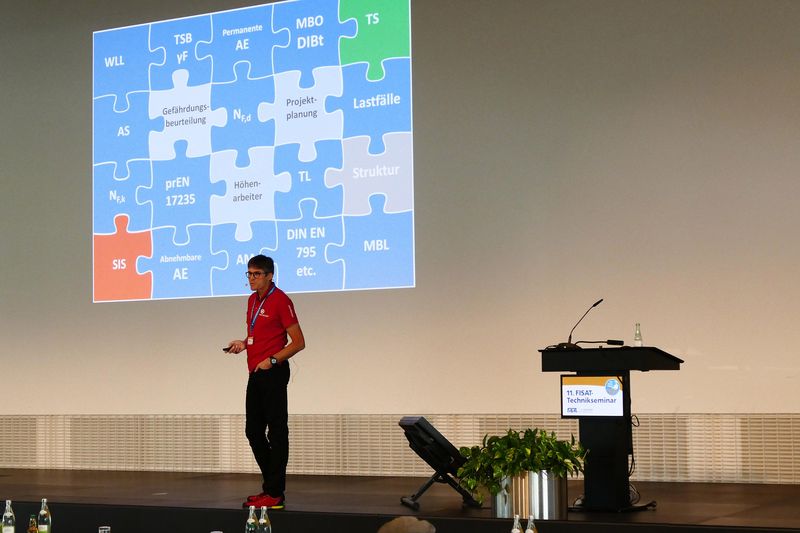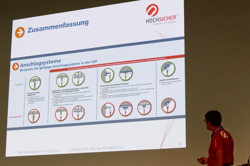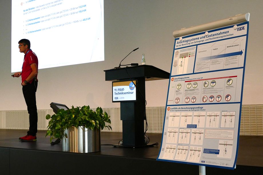 Markus Füss, Ingenieurbüro HOCHSICHER, vertiefte seine Überlegungen aus dem Vorjahr zum Thema „Lastannahmen in der Seilzugangstechnik“. Für den zweiten Teil seines Vortrags entwickelte er sein Projekt zusammen mit dem FISAT weiter: Der FISAT hat zu dieser Thematik ein Informationsplakat zusammen mit ihm und der Illustratorin Julia Kotulla entwickelt, welches für alle FISAT-Mitglieder über die Geschäftsstelle bezogen werden kann. Wir wollen damit allen Interessierten ein aussagekräftiges, selbsterklärendes Arbeitsmittel zu den Themen Gebrauchslast, Traglast, Mindestbruchlast, Anschlagssysteme und beispielhafte Lastfälle zur Verfügung stellen. Die Entwicklung einer kleinformatigen Version des Informationsmaterials ist bereits in der Planung.