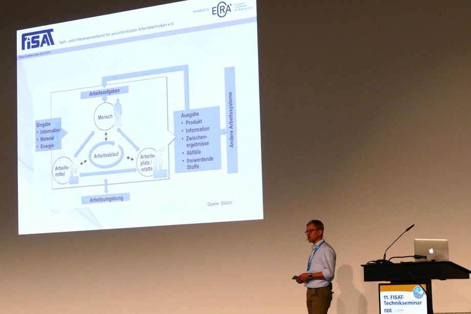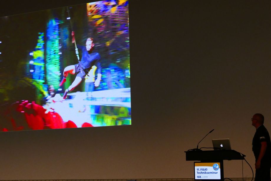 Danach ging es mit Willem Catianis – Höhenarbeiter, Abteilungsleiter und Berater bei der Musicalproduktion „Tarzan“ – ab hinter die Kulissen: Seine Präsentation „Fliegen im Theater am Beispiel Tarzan“ gewährte interessante Einblicke in die Arbeitswelt des auf Theaterrigging und „Menschenfliegen“ spezialisierten Experten. Er stellte Sicherheitskonzepte, das Material sowie Wartung und Prüfung der eingesetzten Arbeitsmittel vor.