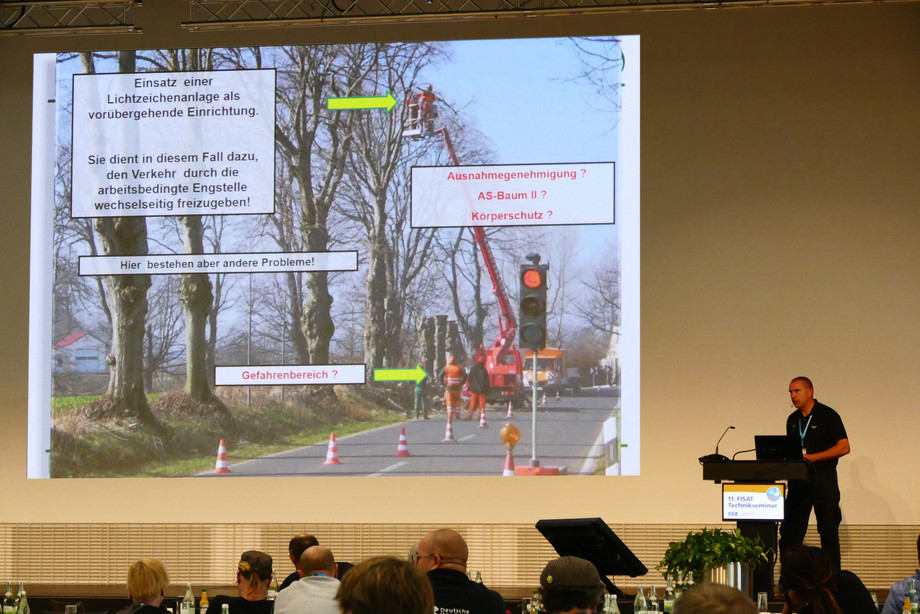 Carsten Beinhoff von der SVLFG, dessen Hauptaufgabengebiet dort die Betreuung von Unternehmen aus dem Bereich Baumpflege und seilunterstützte Baumarbeiten im Bereich Prävention ist, wandte sich in seiner Präsentation dem oftmals etwas stiefmütterlich und mit mangelnder Sachkenntnis der gesetzlichen Rahmenbedingungen behandelten Thema „Eingriff in den Straßenverkehr“ zu.