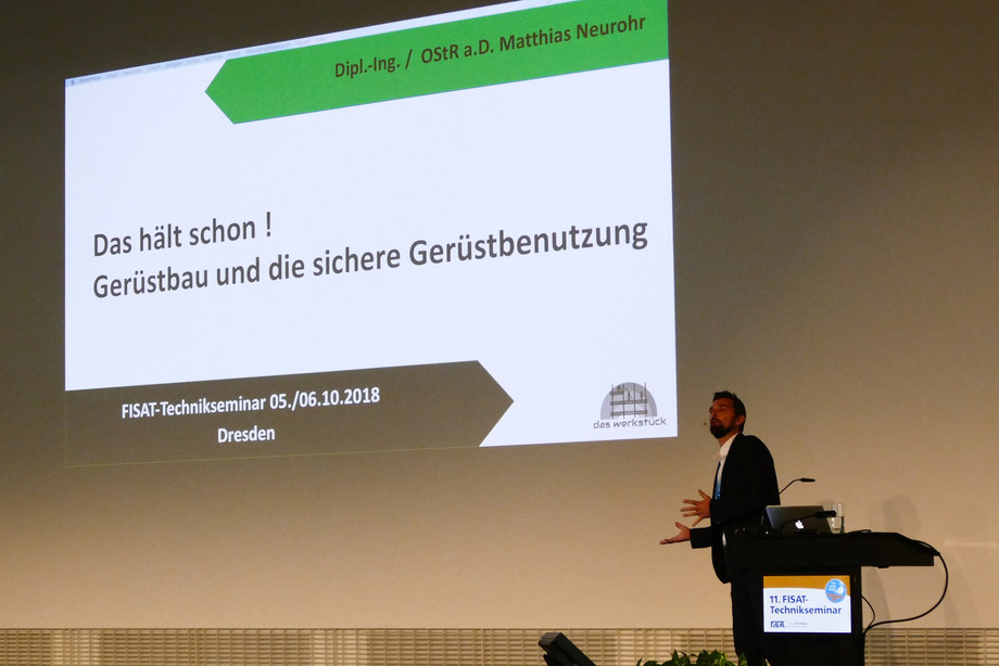 „Das hält schon noch – Gerüstbau und sichere Gerüstbenutzung“: Matthias Neurohr, Dipl.-Ing. (Architektur) und Oberstudienrat a.D., gab in seinem Vortrag einen Einblick in die derzeit gängige Praxis auf Baustellen, die rechtlichen Grundlagen sowie die technischen Maßnahmen, die Unfälle effektiv verhindern können.