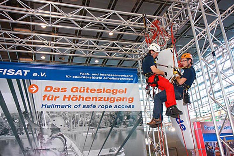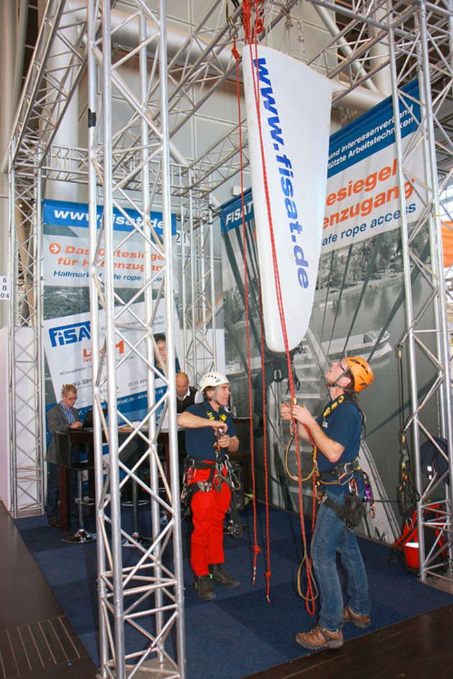Der FISAT nutzte unter anderem die Gelegenheit, um den Fachbesuchern das seilunterstützte Zugangsverfahren am Messetand vorzuführen. Thematischer Schwerpunkt war in diesem Jahr jedoch das mehrstufige Zertifizierungsverfahren des FISAT zum Höhenarbeiter. Es bietet höchste Transparenz und Sicherheit für Anwender und Auftraggeber.