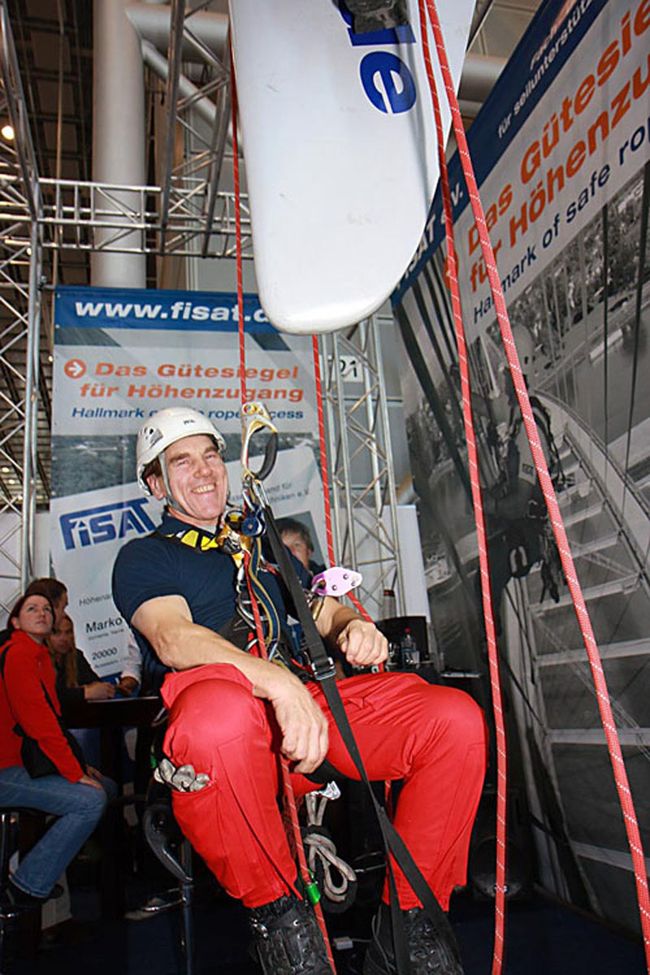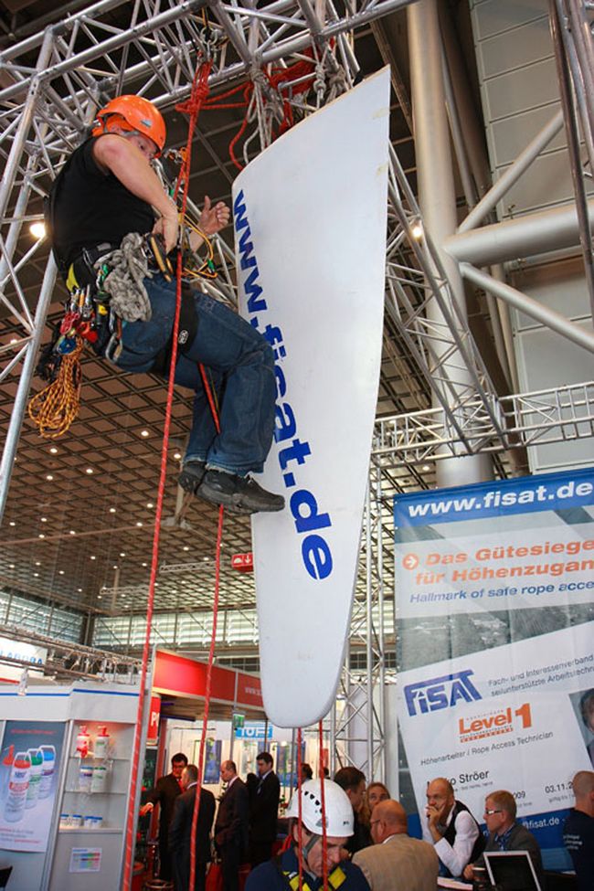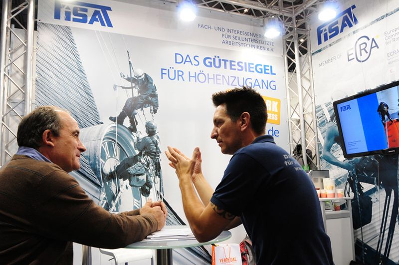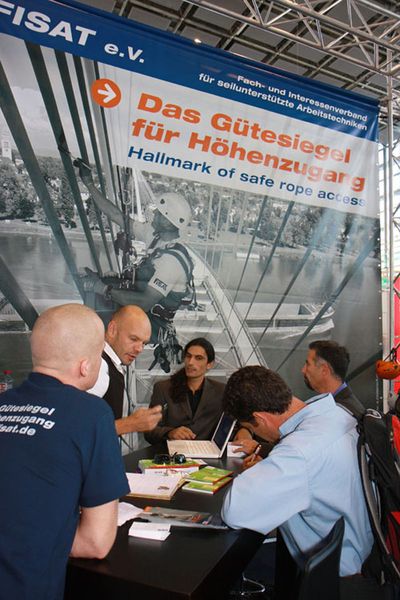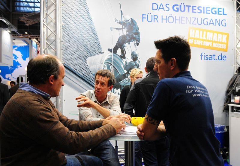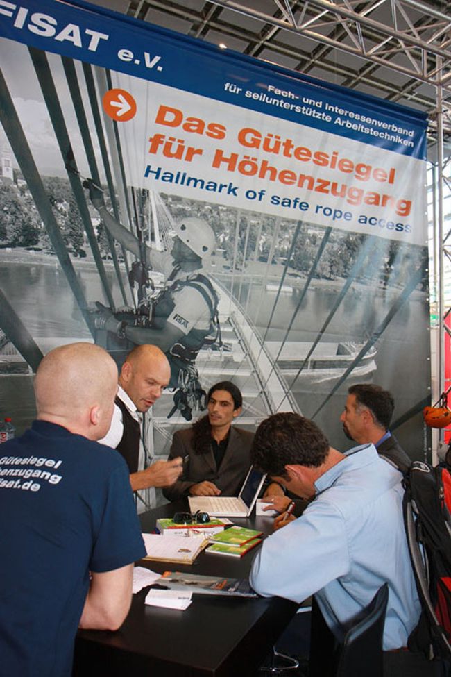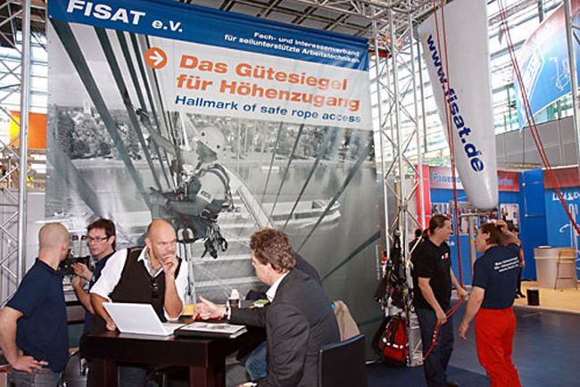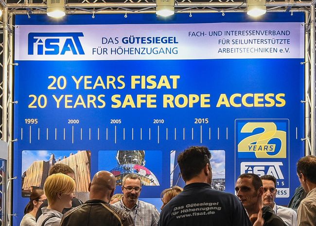 Der weltweite Einsatz von FISAT-zertifiziertem Personal unter Einhaltung höchster Sicherheitsstandards und die bewusste Integration des European Committee for Rope Access (ECRA) in die Präsentation auf dem FISAT-Stand waren häufig der Anlass für interessante Gespräche mit Anwendern, Behördenvertretern, Herstellern und Vertretern weiterer Industriekletterverbände. Mehr als einmal wurde dabei deutlich, dass die Interessenvertretung der FISAT-Mitgliedsbetriebe im Rahmen der größten Messe für Arbeitsschutz und Arbeitssicherheit essentiell notwendig ist, da wertvolle Aufklärungsarbeit geleistet wurde und die Seilzugangstechnik als sicheres und effizientes Zugangsverfahren in Wort und Bild eindrucksvoll präsentiert werden konnte.