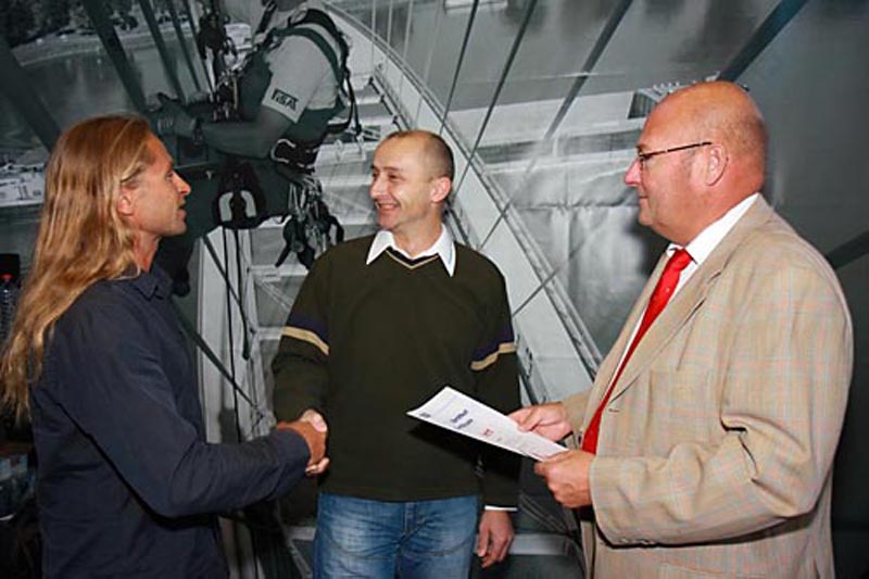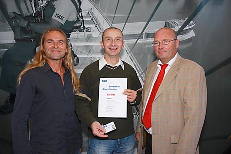 Am ersten Messetag überreichten Präsident Bernd Redlin und Generalsekretär Frank Seltenheim feierlich den ersten fälschungssicheren Ausweis der neuen Serie. Dirk Otto, Betriebsleiter für Neuentwicklungen bei der Hängebühnen-Firma Asmus und gelernter Elektromeister, hatte im Oktober den Grundkurs Seilzugangstechnik absolviert und die anschließende FISAT-Prüfung bestanden. „Nach dem einwöchigen Kurs fühle ich mich viel sicherer im Umgang mit der Seiltechnik“, sagte der 41-Jährige. Für den Asmus-Mitarbeiter ist der Kurs eine Zusatzqualifikation, für den Fall, dass die Hängebühne einmal streikt. „In solchen Notfällen müssten wir jetzt nicht mehr auf die Feuerwehr warten, sondern könnten uns mithilfe der Seilzugangstechnik selbst retten“, so Otto.